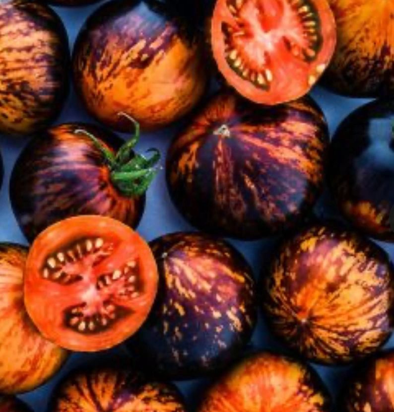 The round, 3- to 3.5-ounce fruit develop brushstrokes of ebony, crimson, and orange; cut into the fruit to reveal a stunning vermillion color, fragrant, sweet, and loaded with rich tomato taste!