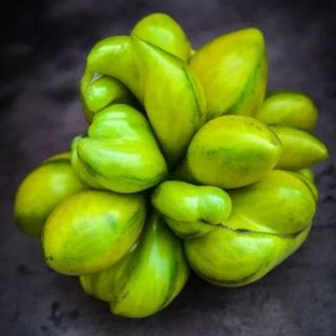 Incredible bumpy, glowing green finger tomatoes! Philippe Rommens, a tomato breeder from France, pulled characteristics from the reisetomate, or traveler tomato, to create this fanciful fusion.