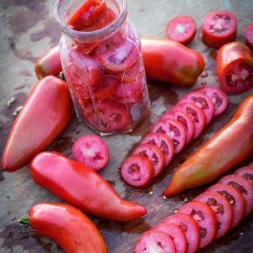 A unique, pepper-shaped fruit in vivid crimson color from New Jersey, this variety is perfect for bright red, robust sauces as well as for fresh eating.